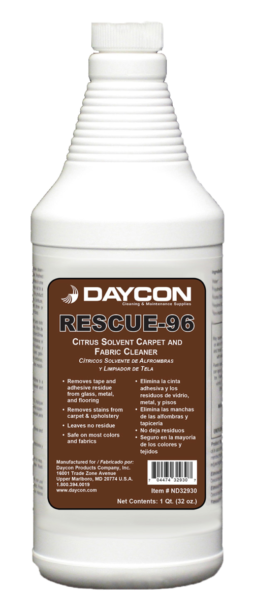 Rescue 96 is a citrus solvent used as an alternative to ozone depleting chlorinated solvents. It can be used to clean and spot carpets, upholstery, and other fabric surfaces. Rescue 96 dries quickly and completely, leaves no residue, and gives performance comparable to chlorinated solvents. It dissolves many hard to remove materials such as tar, asphalt, wax, grease, ink, glue, lipstick, crayon, rubber burns, gum, nail polish, some paints, and many oil substances. Also, it is safe on most colors and fabrics.